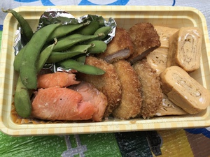 枝豆、焼鮭、豚ヒレ肉パン粉焼き、だし巻き玉子