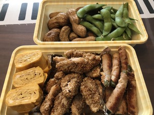 ゆで落花生、枝豆、だし巻き玉子、ササミのゴマ焼き、インゲン豚肉巻き