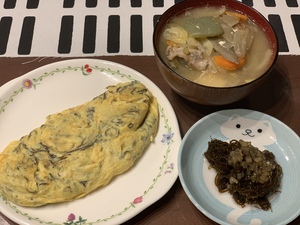 もずくオムレツ、もずく自家製玉ねぎドレッシングのせ、豚汁