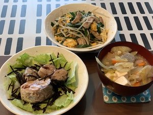 レタスを敷いて、サバ缶からそのままのせて、ヒジキも少しふりかけて、さらにオリーブオイルをかけました。